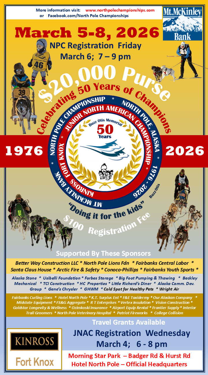 There is no place like Alaska and no better place to be in late February and March than right here in the Interior of our magnificent state. Whether you are here to race your dog team on the trails that have been noted as some of the best in the world, skijor on the training trails of champions, or supporting and cheering on your favorite athlete, we are anxious to welcome you to North Pole, Alaska.